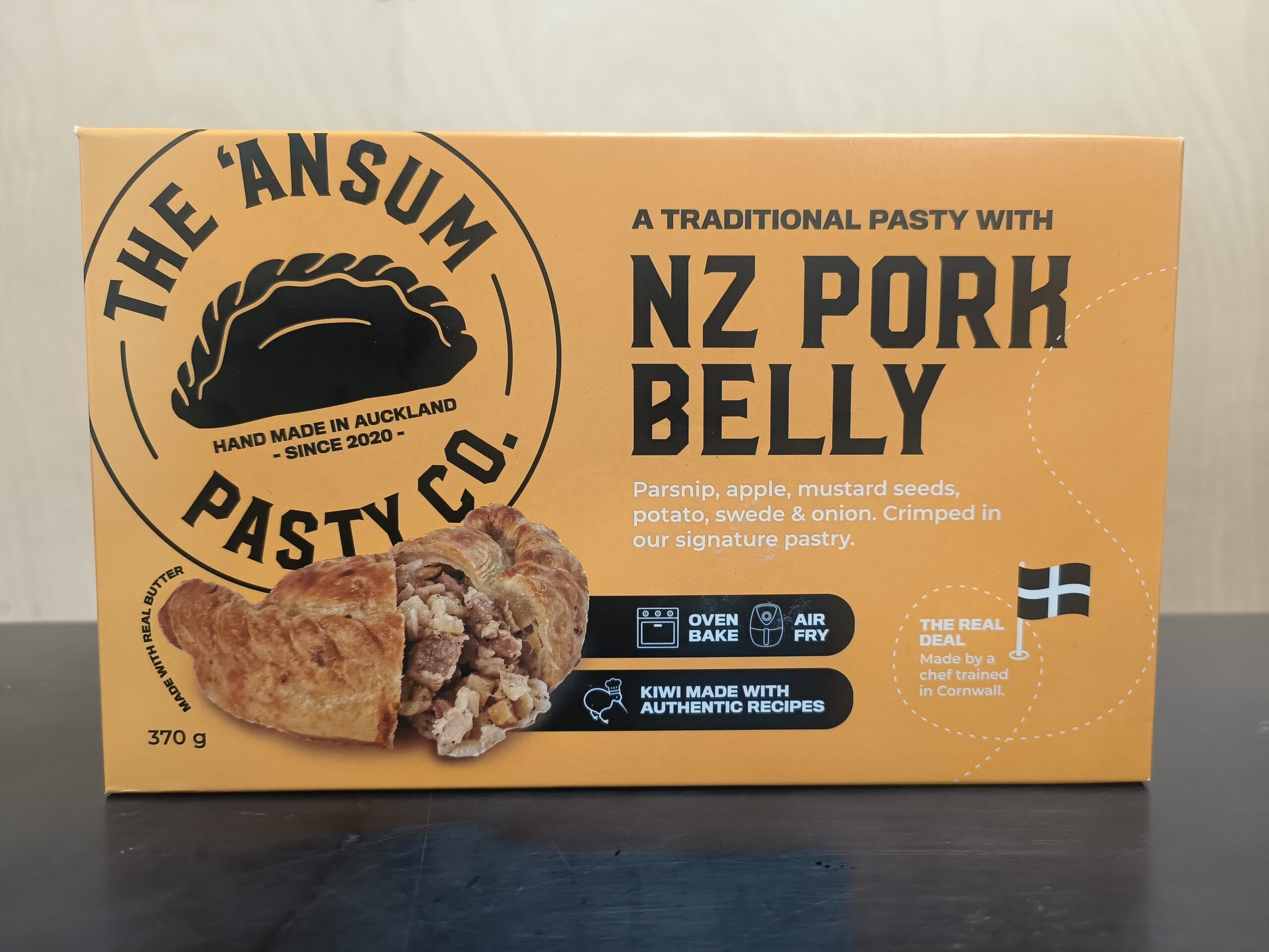 The Ansum Pasty Co – Pork Belly: NZ pork belly and sweet apple, mustard seeds, parsnip, onion, and agria potato.